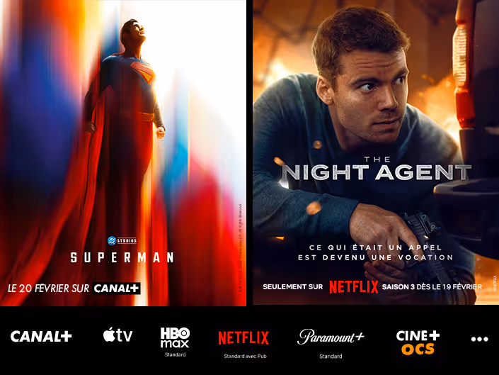 * Tarifs hors promotion en vigueur le 16/01/2026, susceptibles d’être modifiés dans le respect des conditions générales d’abonnement. Tarifs valables pour tout nouvel abonnement d’une durée de 12 mois ou 24 mois + mois en cours. Décodeur inclus (hors opérateur tiers). Décodeur 4K-UHD disponible uniquement par satellite. Hors frais d’accès (30€ pour un abonnement de 12 mois + mois en cours, offerts pour un abonnement de 24 mois + mois en cours). Pour le satellite (hors opérateur tiers) : parabole, kit d’installation et installation satellite offerte sous conditions (voir page « TARIFS ET MODALITÉS DE PAIEMENT » de la fiche tarifaire). Pour le réseau internet : sous réserve de disposer d’une connexion internet avec débit suffisant. Pour un abonnement via un opérateur tiers : hors coûts liés aux services et aux matériels de réception de l’opérateur. Les options et services sont avec abonnement mensuel. Plus d'informations sur toutes les offres disponibles à la page produit.